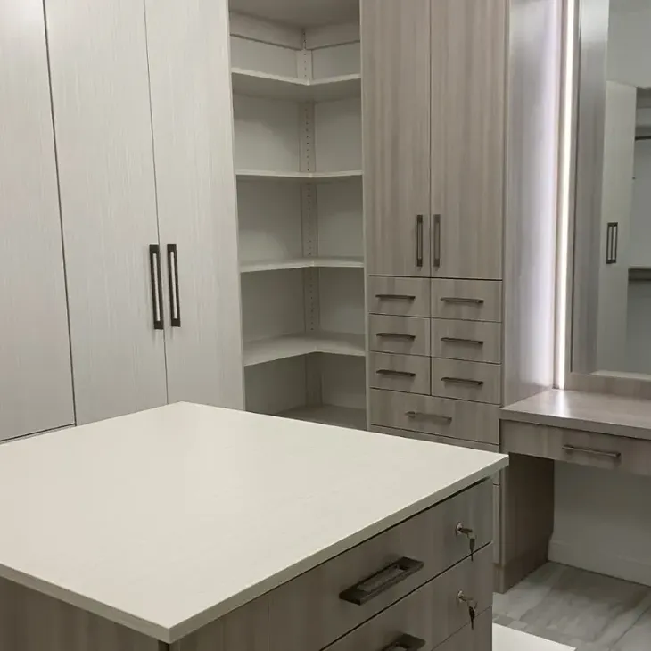 Our expert designers collaborate with you to create custom closet designs that perfectly suit your needs and preferences. Your personalized storage solution will combine both beauty and functionality, ensuring you never have to choose between style and practicality. Select from a wide range of styles, materials, finishes, hardware, and accessories to design the ideal closets, kitchen countertops, pantry, garage organization, or storage system tailored to you.